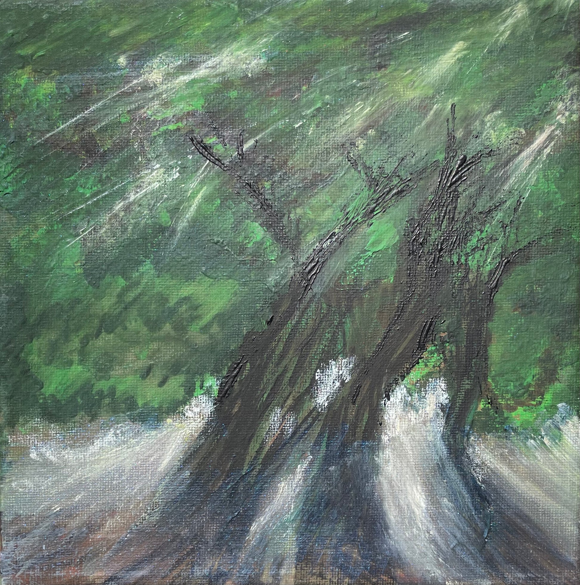This original painting captures the force of nature in motion — trees bending under the weight of wind and water, while beams of light cut through the forest. Shades of green and blue blend in a vibrant whirlwind, evoking both chaos and harmony in the natural world.